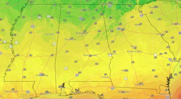 以下是美国国家气象局提供的阿拉巴马州从午夜到周五早上6点的最低气温: