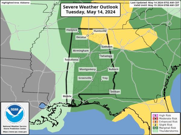 美国国家海洋和大气管理局的风暴预测中心在最新的预报中,将阿拉巴马州北部部分地区的恶劣天气风险提高到5级中的2级。2级风险意味着可能会有零星的强风暴。