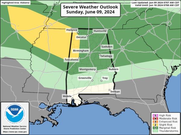 今天,美国国家海洋和大气管理局风暴预测中心将阿拉巴马州北部和西部部分地区的恶劣天气风险提高到5级中的2级。2级风险意味着可能会有零星的强风暴(见本文顶部的展望)。