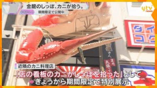 大阪道顿堀地区的“金龙拉面道顿堀”招牌上的龙尾因延伸到附近的一家酒店而被切断,多亏了附近的一家螃蟹餐厅,它找到了新的归宿。