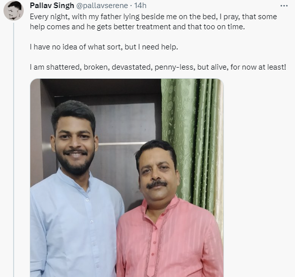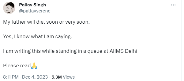 在这篇广为传播的帖子中,帕拉夫是这样开头的:“我父亲很快就会死。是的,我知道我在说什么。我是在德里AIIMS排队时写这篇文章的。”他接着讲述了他生活中持续不断的挣扎,透露他的父亲在9月份心脏病发作,在被诊断出三条动脉堵塞,心脏功能只有20%后,他一直在戈拉克布尔(他的家乡德奥里亚)和德里之间穿梭,接受进一步治疗。