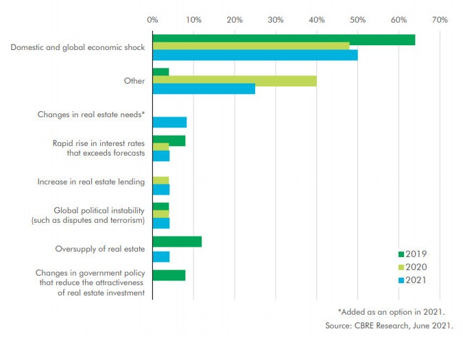 世邦魏理仕报告称,房地产金融市场面临的最大威胁仍然是“国内或国际经济冲击”,有50%的银行给出了这个答案,比去年上升了两个百分点。贷方可能会保持一定程度的谨慎。