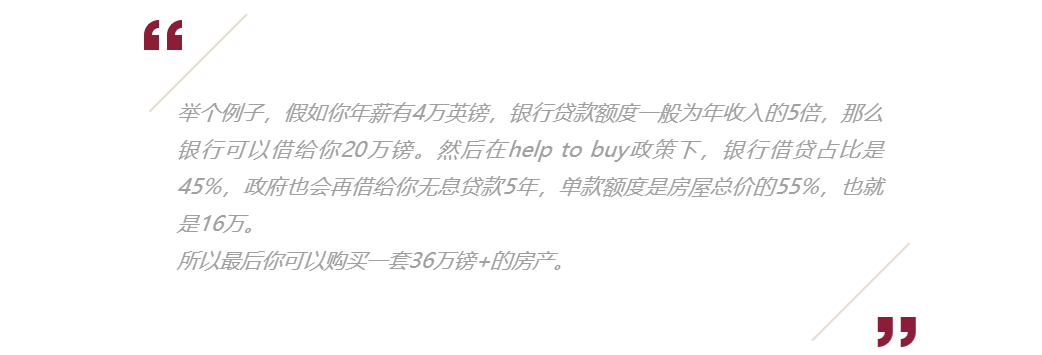 比如,如果你是已经毕业,留在英国工作的「异乡人」,并且计划购置一套房屋的话,那你可能需要了解help to buy 这个政策。该政策下,伦敦地区的购房者只需准备5%的首付款。