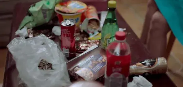 桌子上铺满了吃剩的泡面桶和没喝完的饮料。