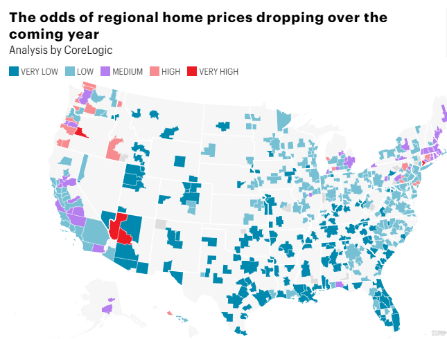 在接下来的 12 个月中,CoreLogic 预测美国房价仍将再上涨 5.9%。然而,这家房地产公司计算得出,一些区域性房地产市场出现下跌的可能性较高。