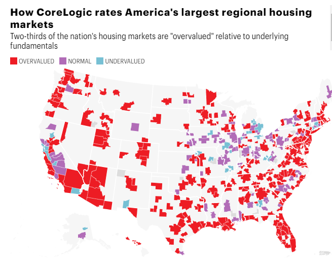 这家房地产公司计算了大约 400 个大都市统计区域的市场风险评估。CoreLogic 旨在找出当地收入水平是否可以支撑房价。这一发现?CoreLogic 现在认为,美国 67.9% 的区域房地产市场被“高估”。早在 4 月份,CoreLogic 的分析就有 64.7% 的房地产市场被“高估”。与此同时,CoreLogic 现在表示,只有 24.5% 的美国房地产市场是“正常的”,只有 7.6% 是“被低估的”。