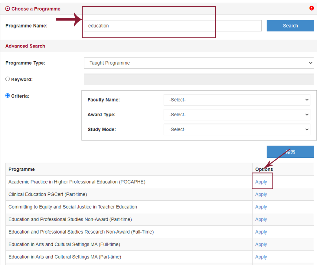 搜索你想要申请的专业,比如我这里搜索教育,往下就会跳出相关的专业,点击Apply即可。